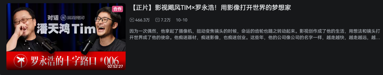 最近,我观看了罗永浩对话“影视飓风”创始人Tim的深度访谈,感触颇深。在内容创作这条日益拥挤的赛道上,Tim和他的“影视飓风”无疑是一个现象级的存在。