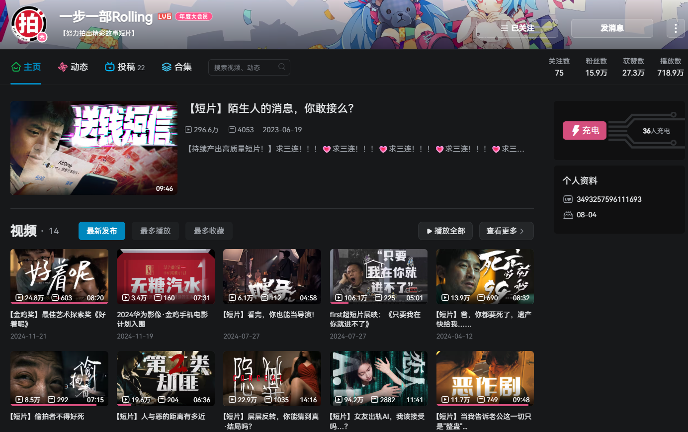 内容上,他的目标是“年轻版国家地理” 。他规划了清晰的路径,在短期冲击奥斯卡短片提名,长期则扩展至纪录片、教育,乃至线下科技展览。在看了这期访谈我才知道Tim在B站还有个高质量短片号“一步一Rolling”