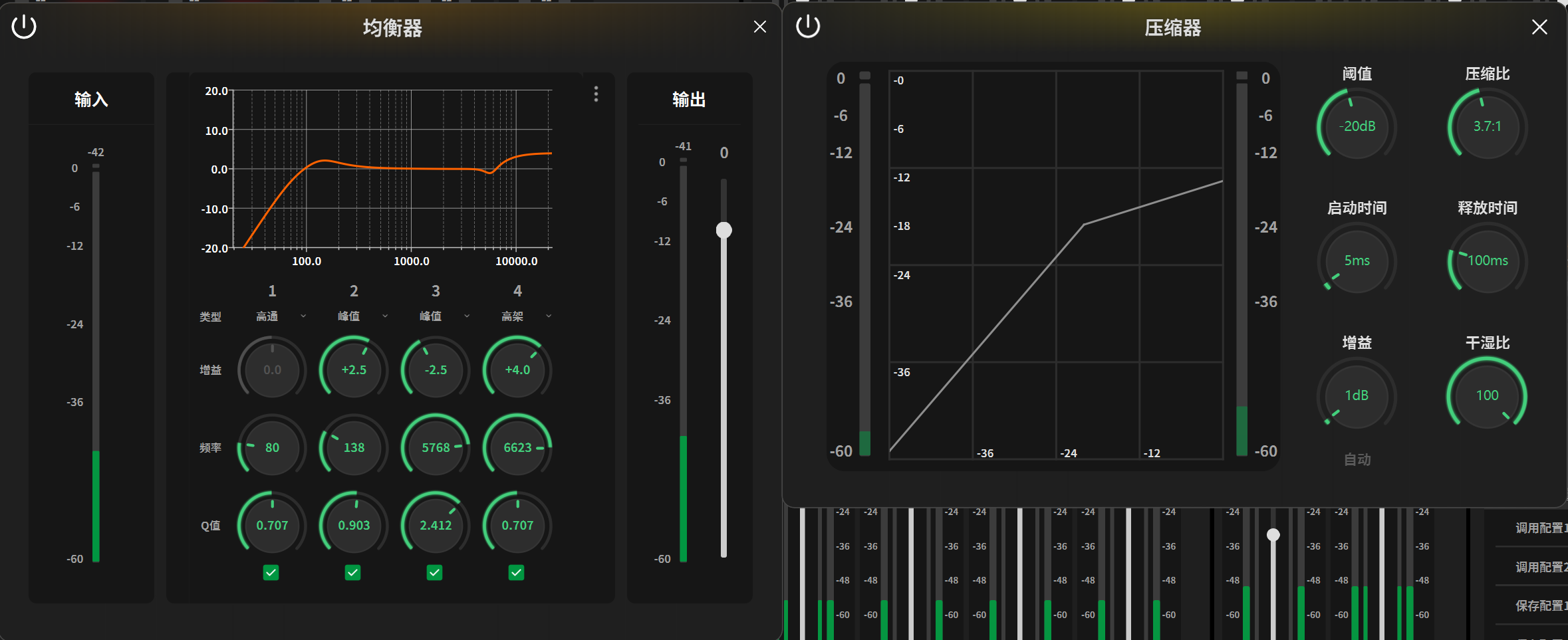 AI 降噪与 EQ: 内置 AI 智能降噪 NC1,在嘈杂的户外直播也没问题,它会将背景中的噪音智能的降噪,虽然这个模式会带来20ms左右的延迟,但是效果比起使用传统的降噪效果是要好很多的;如果你追求无延迟且不想损失高频细节的玩家,那么M62还提供了 NC2 模式, 也就是传统的噪声门,它会将达到这个阈值的声音放行,达不到的直接一刀切掉,实际用哪个还是取决于你的使用场景。M62 在输入/输出都可以调整EQ,输入两个通道分别有四段EQ调整,可以针对你的麦克风特性进行微调。