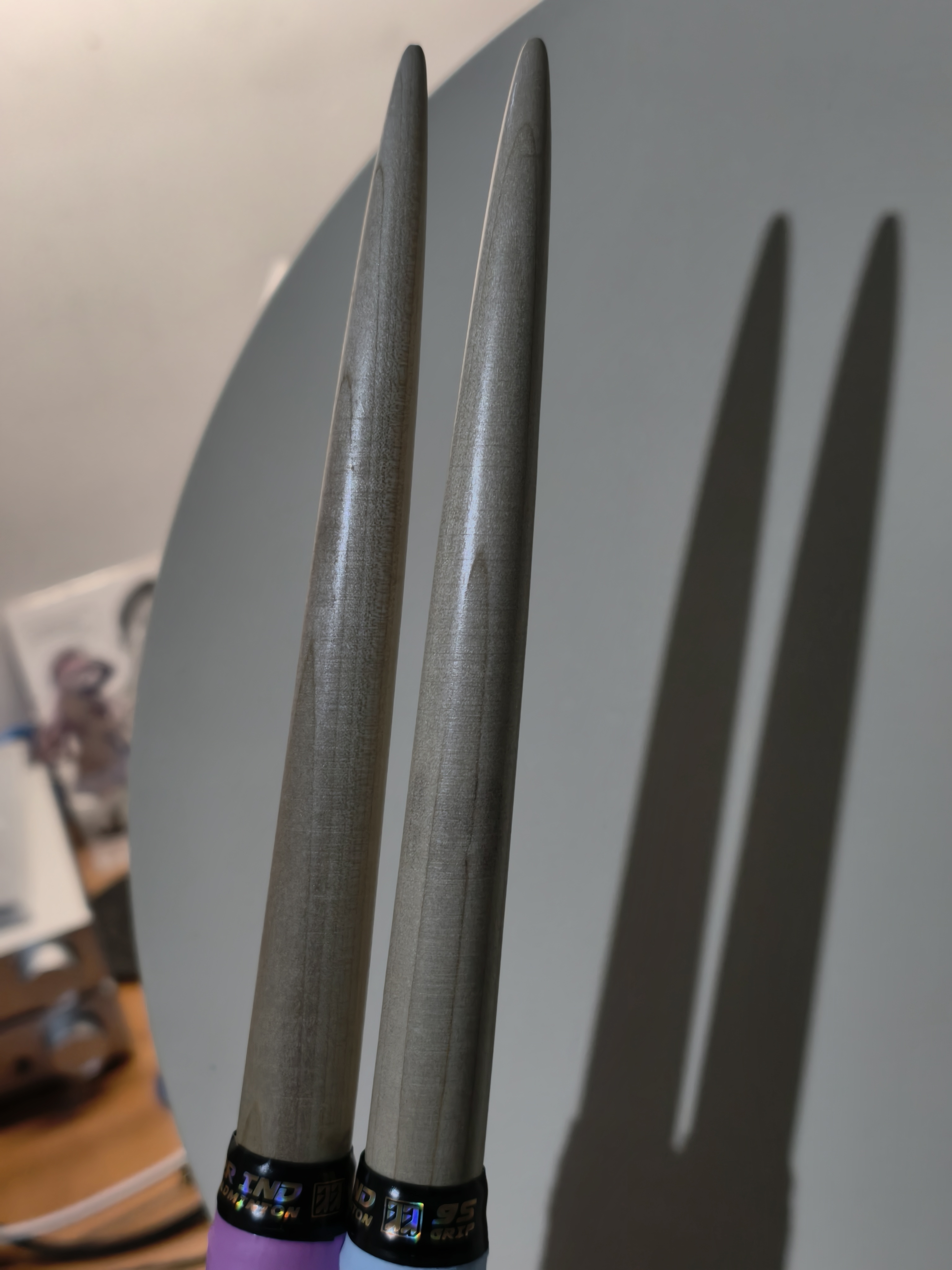 来自单手全连逆战的《提亚马特》朴木鼓棒,长度38cm,重量59.5+62g,直径20mm,这对鼓棒我是目前的主力棍,它基本上确实属于万能了,表面10000目+硬漆抛光,工艺好的同时重量控制的也恰到好处,因为是可以定制长度和重量的,所以买到的肯定是适合自己使用的,同时这对棍子回弹能力很强,打击感很清晰,能很清晰辨认击打了几次,不会有黏连模糊的情况,当然这么好用的棍子价格也是这几幅棍子中最贵的。
