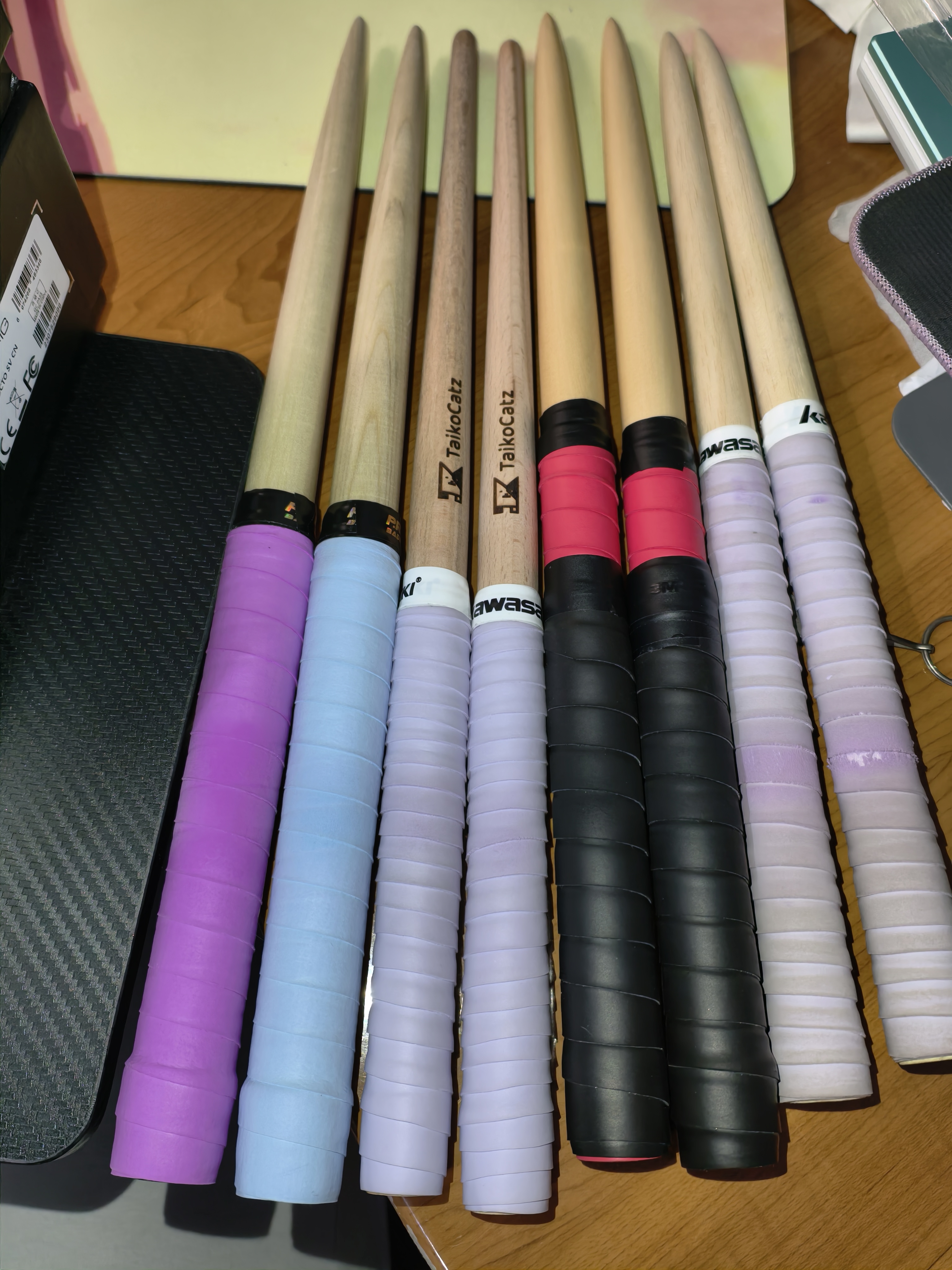 这是我从入坑以来购买的所有鼓棒了,鼓棒只能让你玩得更舒服,并不能大幅提升你的底力,这些鼓棒最大的区别还是材质和工艺的差距了,选择好你的主力棍以后就不建议经常换棍子了,换鼓棒后需要不短的适应磨合时间。
