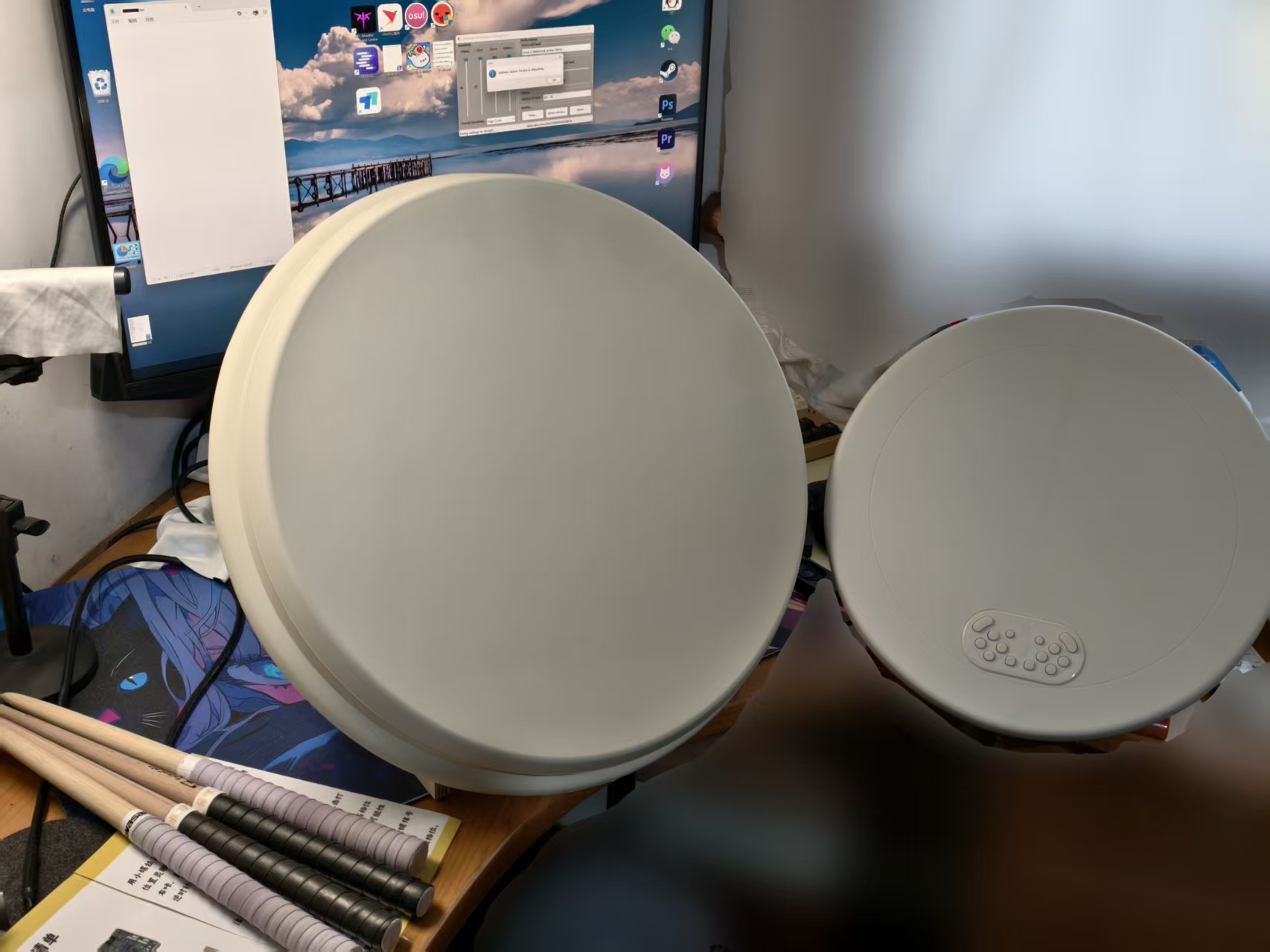 良值这款鼓是最便宜的大鼓面的控制器了,虽然距离街机的43CM大小有些距离,但是在我新人入坑练习来说已经够用了,且良值买鼓就送木质鼓棒,类似公棒的形状但是重量减轻,我练习了两个月后已经能玩魔王难度的6-7星了,但我渐渐发现良值的鼓面太软,手感和机厅的鼓面打击手感差异很大,鼓面回弹不佳,且底座的角度和街机角度不一样,良值鼓的是整体塑料结构,中间也是挖空的,所以敲击起来杂音会比较多,塑料感也会比较重。所以我又考虑购入43CM尺寸鼓面的鼓,经过多番对比,最终选择了猫鼓Pro TaikoCatz,虽然鼓的价格高出了不少,但到货后发现物有所值。